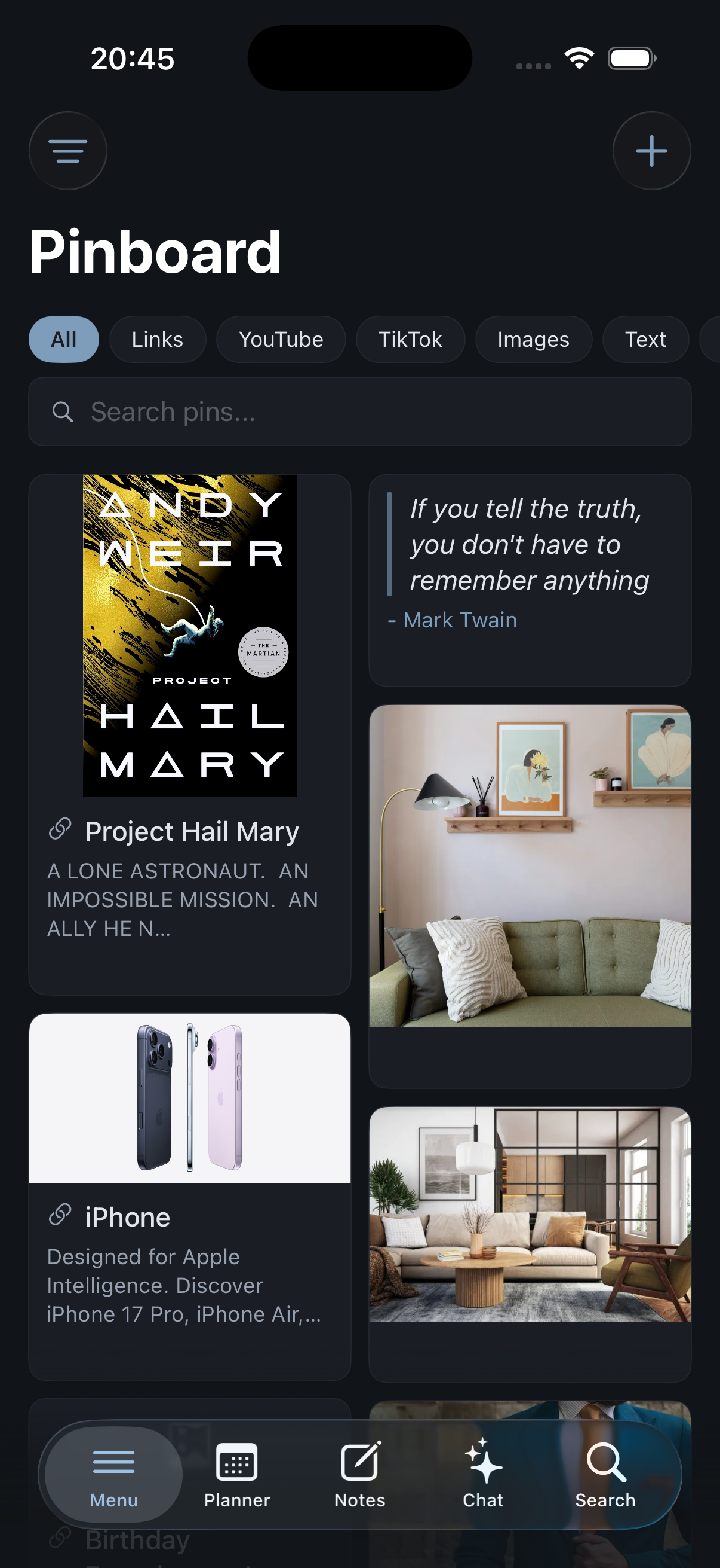 Bring ideas together on the Pinboard. Save URLs, images, videos, and text snippets. AI-powered vision analyses your images for easy searching. Read articles ad free.