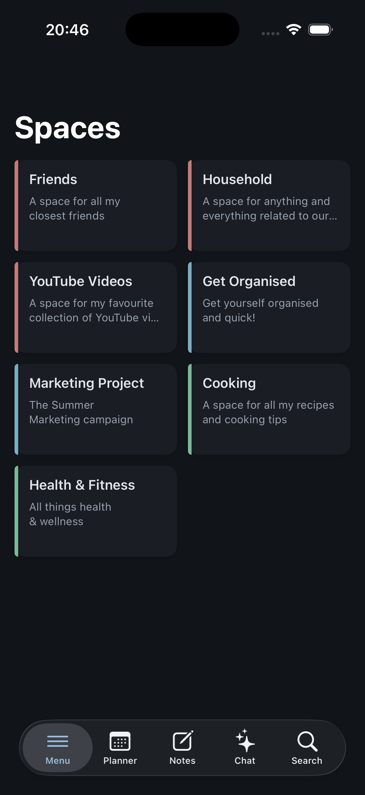 Organise your tasks, notes, pins and library into Spaces. Share spaces with other users and colour code for extra sparkle. You can even make spaces private to keep from prying eyes.