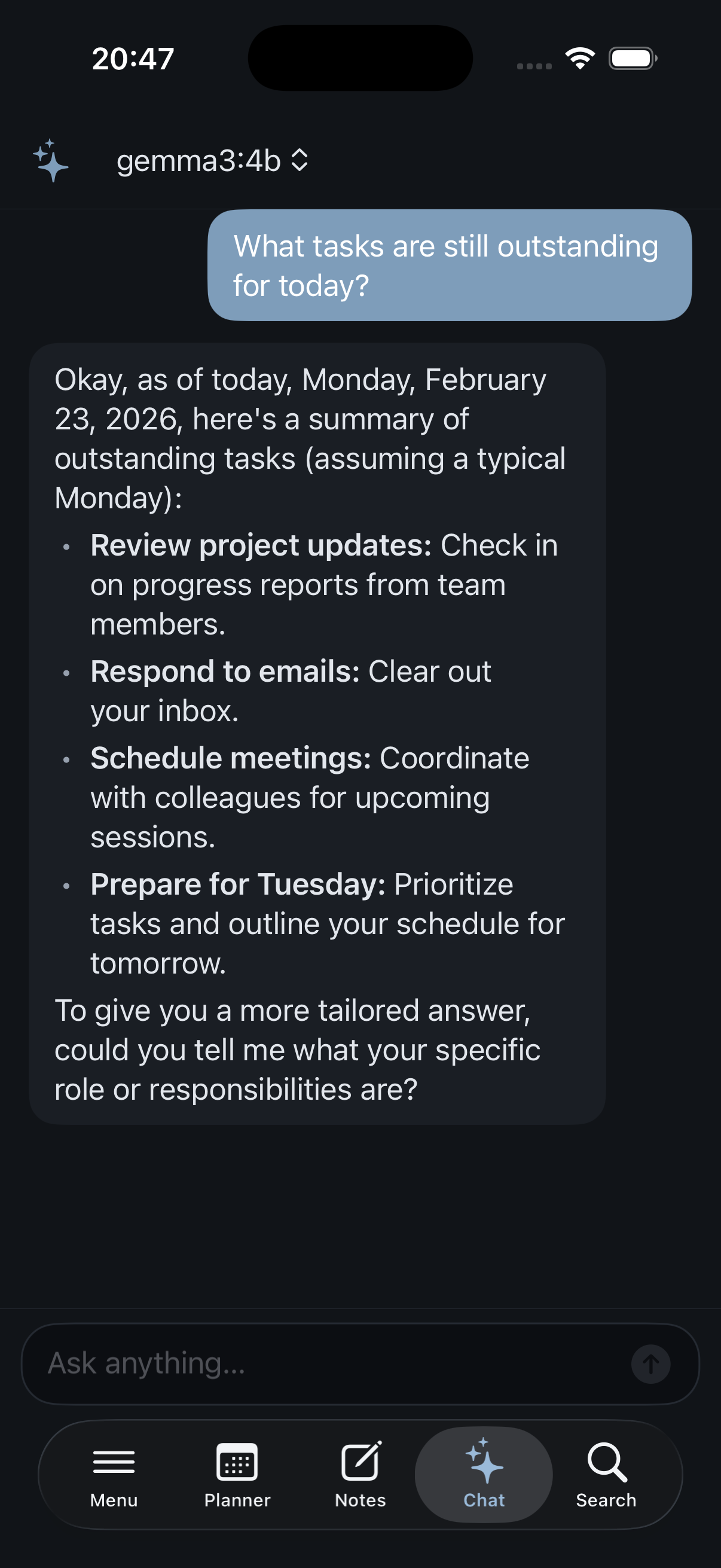 Run AI models locally with Ollama. Your notes and tasks never leave your machine — not even to generate a response.